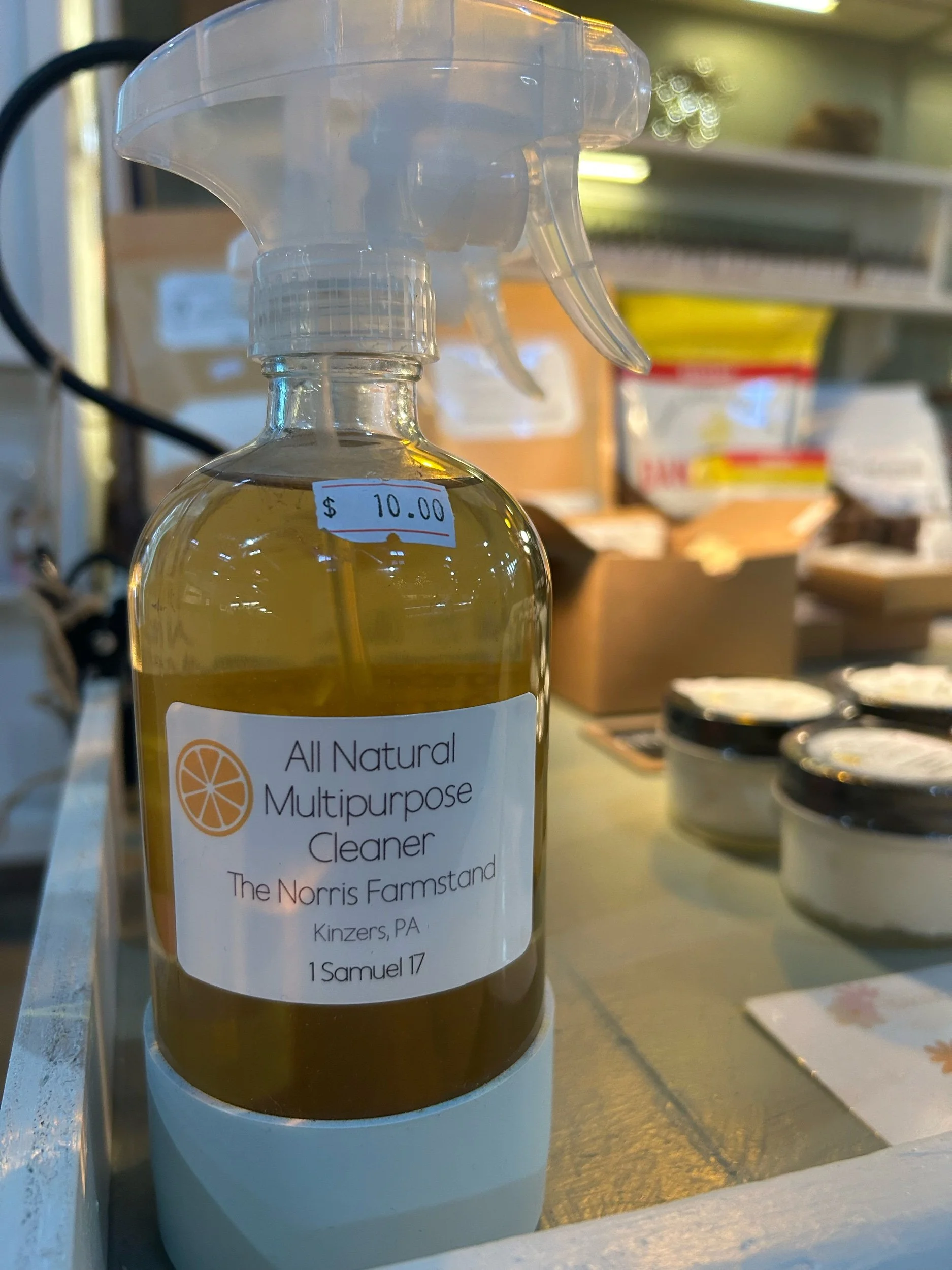 Our amazing multipurpose cleaner is 100% all natural. Includes vinegar, orange, peel oil, and cinnamon. It comes in a glass spray bottle. All refills are five dollars.
